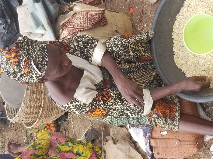 An adult female is depicted seated on the ground in an outdoor market setting in Adonkolo, Nigeria