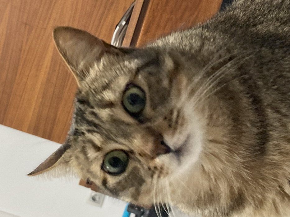 - "A close-up image depicts a domestic short-haired tabby cat, predominantly filling the frame from the chest upwards" by FM-YzcdC3, licensed under CC BY 4.0