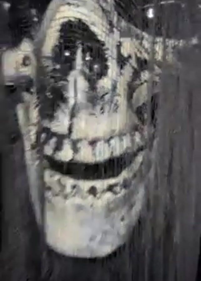 close-up of a scary Halloween decoration. It is a white skull face with a black veil draped over it. The skull has cracks on its forehead and dark eye sockets. It is set against a textured wall that appears to be white or light gray. A creepy, growling sound accompanies the visual.