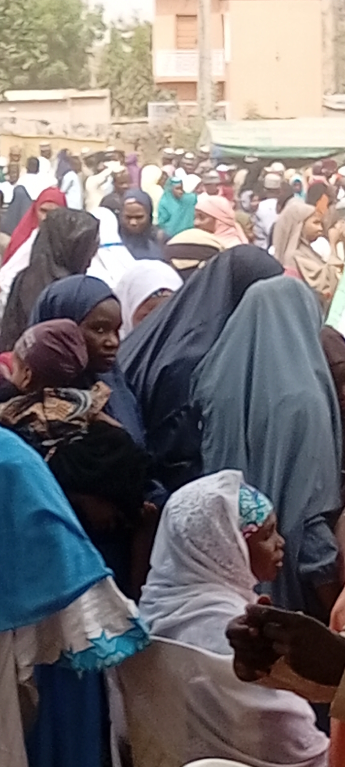 The image depicts a densely packed outdoor gathering of individuals in Dorayi, Nigeria