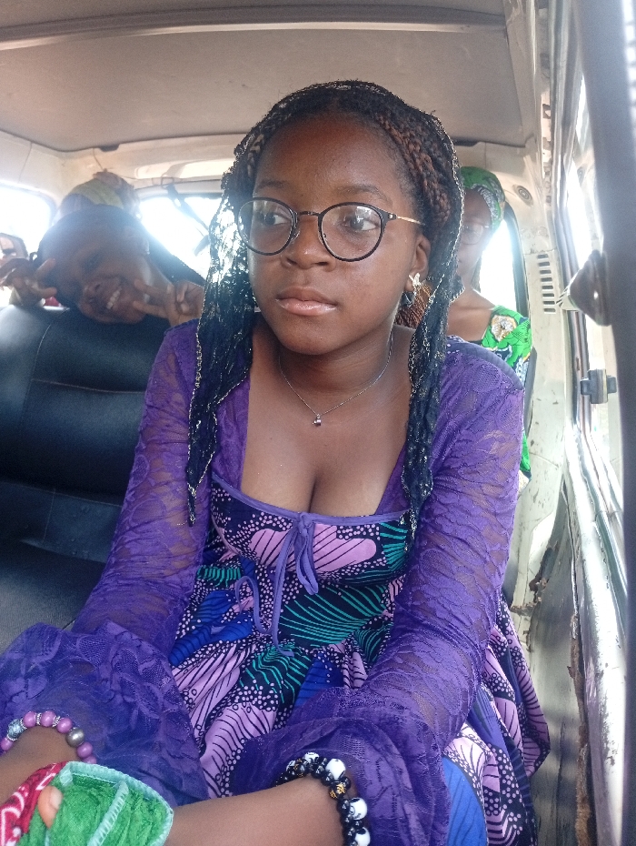 The image depicts the interior of a commercial passenger vehicle, likely a minibus, in Nsukka, Nigeria. In the foreground, a young dark-skinned female, estimated to be in her late teens or early twenties, is seated, facing right with a neutral expression. She wears round, dark-framed eyeglasses, a thin silver-colored chain with a small pendant, and a purple long-sleeved lace top over a multi-colored ankara-patterned dress featuring shades of blue, purple, and green. Her braided hair is visible around her face. On her left wrist, she wears several beaded bracelets including pink/purple pearls, alongside a green fabric item. A black and white patterned beaded bracelet is visible on her right wrist. Behind the primary subject, two other individuals are partially visible. To the left, a second dark-skinned female is seated, smiling and making a 'peace sign' gesture with both hands. To the right, a third individual, also likely female, is mostly obscured, with a green patterned head covering visible. The vehicle's interior features a light-colored ceiling and dark-colored seats. Natural light enters the vehicle, illuminating the scene.