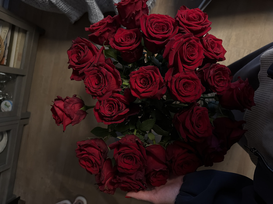 A lush bouquet of deep red roses fills the frame. The roses are tightly clustered, showcasing their velvety petals and intricate bloom patterns. Green leaves peek through the roses, adding depth and texture. A hand gently holds the bouquet, and a section of a cabinet is visible in the background, along with some clothing. The lighting is soft, creating shadows that enhance the roses' rich color.