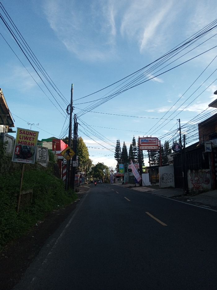 A wide-angle photograph taken at eye-level captures a street scene in Khouathineung, Laos, under a bright, clear blue sky with sparse, wispy clouds. The asphalt road, showing a faded single yellow center line, extends into the distance, where two motorcycles are faintly visible traveling away from the camera. On the left, an elevated, grassy embankment borders the road. A vertical sign displays "SAUNG LIWET MIRAH" in white text on a red background, with an image of food and "190 M" below. Multiple utility poles, heavily laden with crisscrossing black electrical and communication wires, rise from the embankment. On the right side of the road, an "Alfamart" convenience store sign with its red and white logo is prominently displayed above several tall, slender coniferous trees. Numerous black utility lines are tightly bundled against buildings to the right of the Alfamart. Fences and walls with red and white graffiti are visible. Several vertically hanging banners are displayed near the Alfamart. The scene is illuminated by natural light, suggesting early morning or late afternoon, casting some shadows. No pedestrians are distinctly observed.