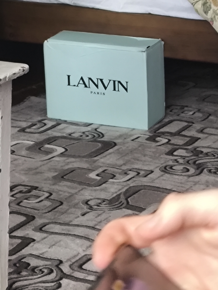 This image depicts an indoor scene in Красный Маяк, Russia. A light blue cardboard box, approximately rectangular, is positioned on a light grey carpet with a repeating dark grey abstract pattern. The word "LANVIN" is printed in black capital letters on the front face of the box, with "PARIS" in smaller black capital letters underneath. The box exhibits minor creasing on its upper corners. Behind the box, a wooden bed frame is visible, partially obscured by white bedding, with a small portion of a light-colored floral pattern visible to the right. In the blurred foreground, a human hand is visible on the bottom right, holding an unidentifiable dark object. A distressed white wooden object, possibly part of furniture, is partially visible on the far left foreground.