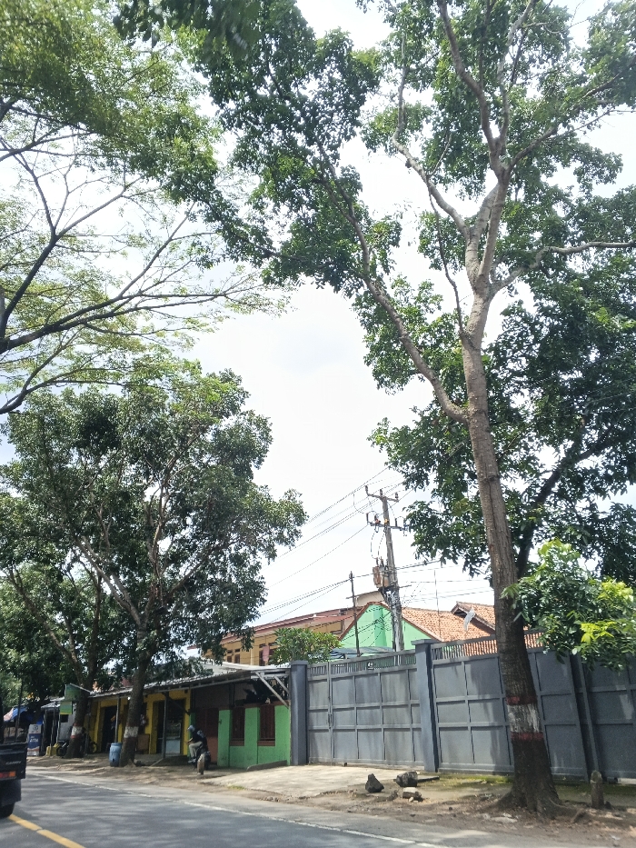 A street view shows colorful shops with worn facades lining a road. A person is on a scooter near a green shop. A large grey metal gate stands next to a tall tree. Power lines stretch across the scene, leading to a utility pole behind the gate. Buildings with orange and green roofs are visible in the background, framed by lush green trees under a partly cloudy sky.