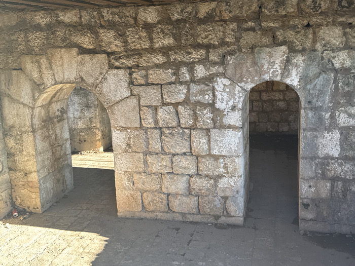 The image displays an interior section of the San Giovanni Fortress or city walls in Kotor, Montenegro. A textured stone wall, constructed from irregularly shaped, light-colored blocks, dominates the view. Two distinct arched openings are present: a wider semicircular arch on the left leads into a brightly lit area revealing further stone walls and a paved outdoor space, while a narrower semicircular arch on the right opens into a dark, shadowed interior chamber. The immediate foreground floor consists of rough stone or compacted earth, partially illuminated by direct sunlight entering from the left, which creates strong shadows. A red and white cylindrical object, appearing to be a discarded can, rests on the ground near the base of the left arch. The ceiling visible at the top of the frame is a rough, unadorned stone surface. No individuals are present.