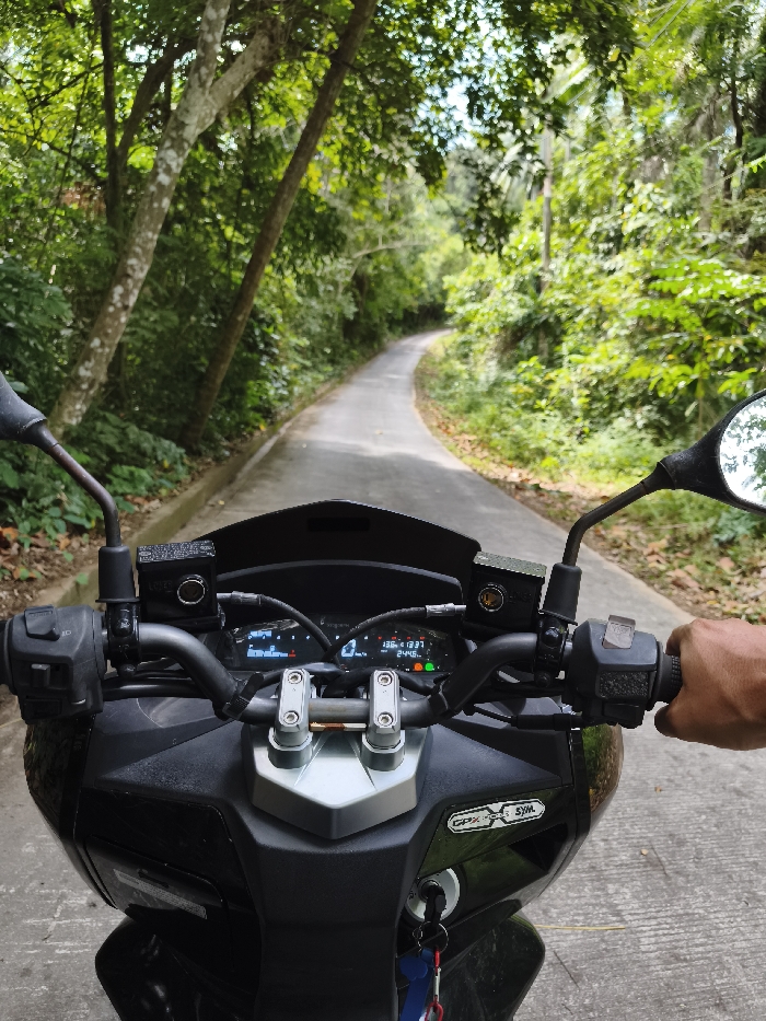 A motorcyclist's perspective on a winding road. Lush green trees form a canopy over the narrow asphalt path, creating a tunnel-like effect. The motorcycle's handlebars, instrument panel, and side mirrors are visible, suggesting a point-of-view shot while riding. The speedometer reads 138 km/h. A hand grips the right handlebar, and keys dangle near the front of the bike. The overall scene evokes a sense of adventure and freedom.