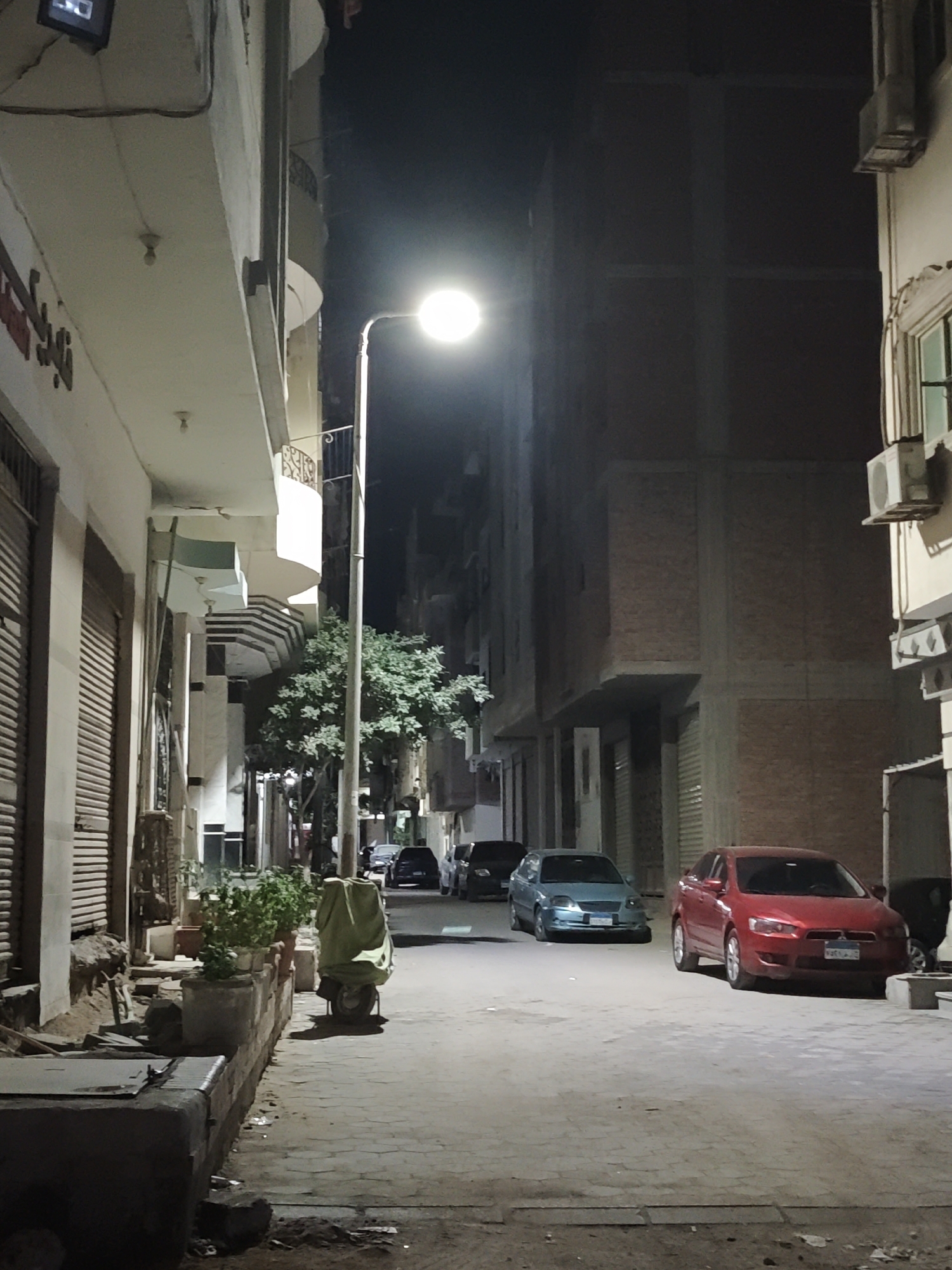dimly lit street in Al Hadaba, Egypt, at night. A single streetlamp illuminates the scene, casting shadows on the buildings that line the street. The street is paved with cobblestones. Parked cars are visible on the right side of the street, including a red sedan and a light blue compact car. A tree is located further down the street. A cart with a green cover is parked on the left side of the street. The buildings on either side of the street are multi-story and have a mix of residential and commercial spaces. The shutters on the storefronts are closed. There is evidence of construction or disrepair on the left side of the street.