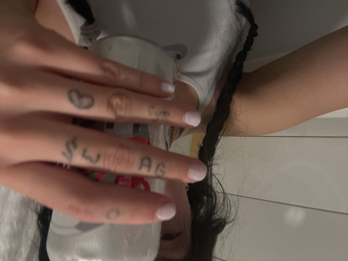 A person's hand with "SWAG" and other tattoos on their fingers holds a clear plastic bottle with a red label. The nails are painted a pale pink. The person has dark hair in a braid. The background appears to be a white wall, possibly a bathroom. The image is slightly blurry and taken at an angle.