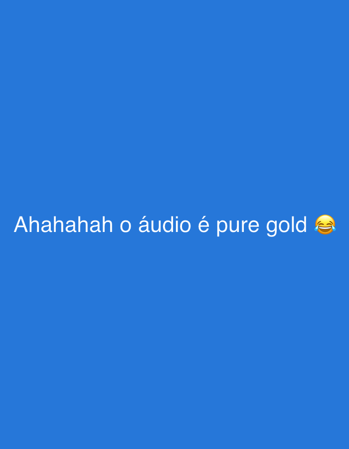 The image features text in Portuguese against a solid blue background. The text reads "Ahahahah o áudio é pure gold" followed by a laughing emoji with tears. The white text is centered and positioned in the lower half of the image, leaving ample blue space above. The overall impression is a simple, text-based meme or reaction.