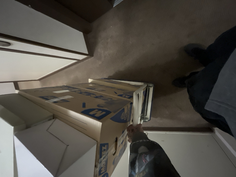 This image depicts a first-person perspective of an individual moving items in a carpeted hallway, located in Orsay, France