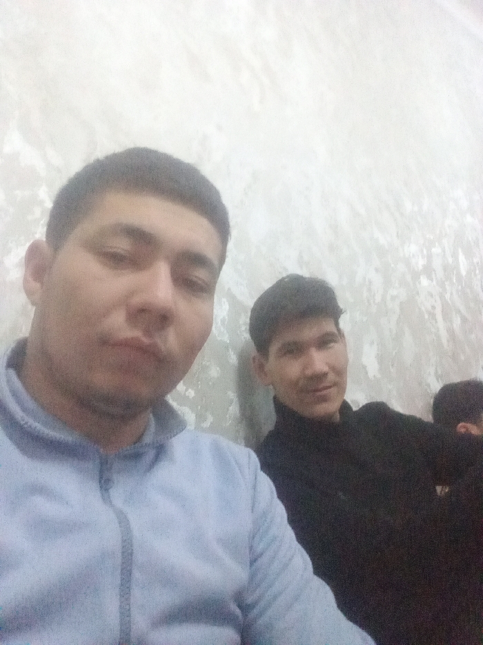 Three men pose indoors. One is in the foreground, wearing a light blue zipper sweater. Another man is in a black jacket, smiling faintly. The third man is partially visible in the background. The wall behind them is textured. The lighting appears dim and somewhat grainy, suggesting a casual or unedited photograph.