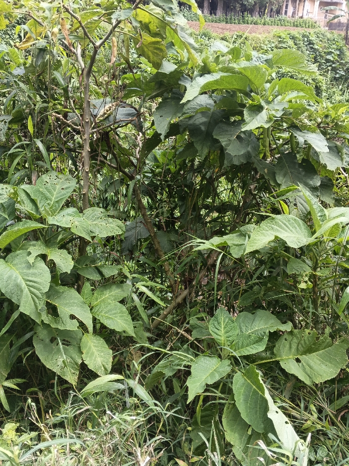 Lush green vegetation dominates the scene, featuring diverse plants with varying leaf shapes and sizes. Some leaves display insect damage. A tree with a textured, branching trunk stands amidst the foliage. In the background, a field or hillside covered in greenery fades into the distance, where a building is visible. The overall impression is one of dense, overgrown nature with a glimpse of human presence in the far backdrop.