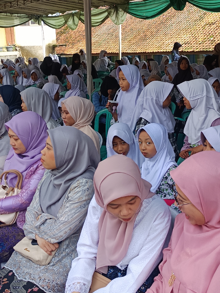 A gathering of women and girls dressed in a variety of hijabs, seated under a tent-like structure with green trim