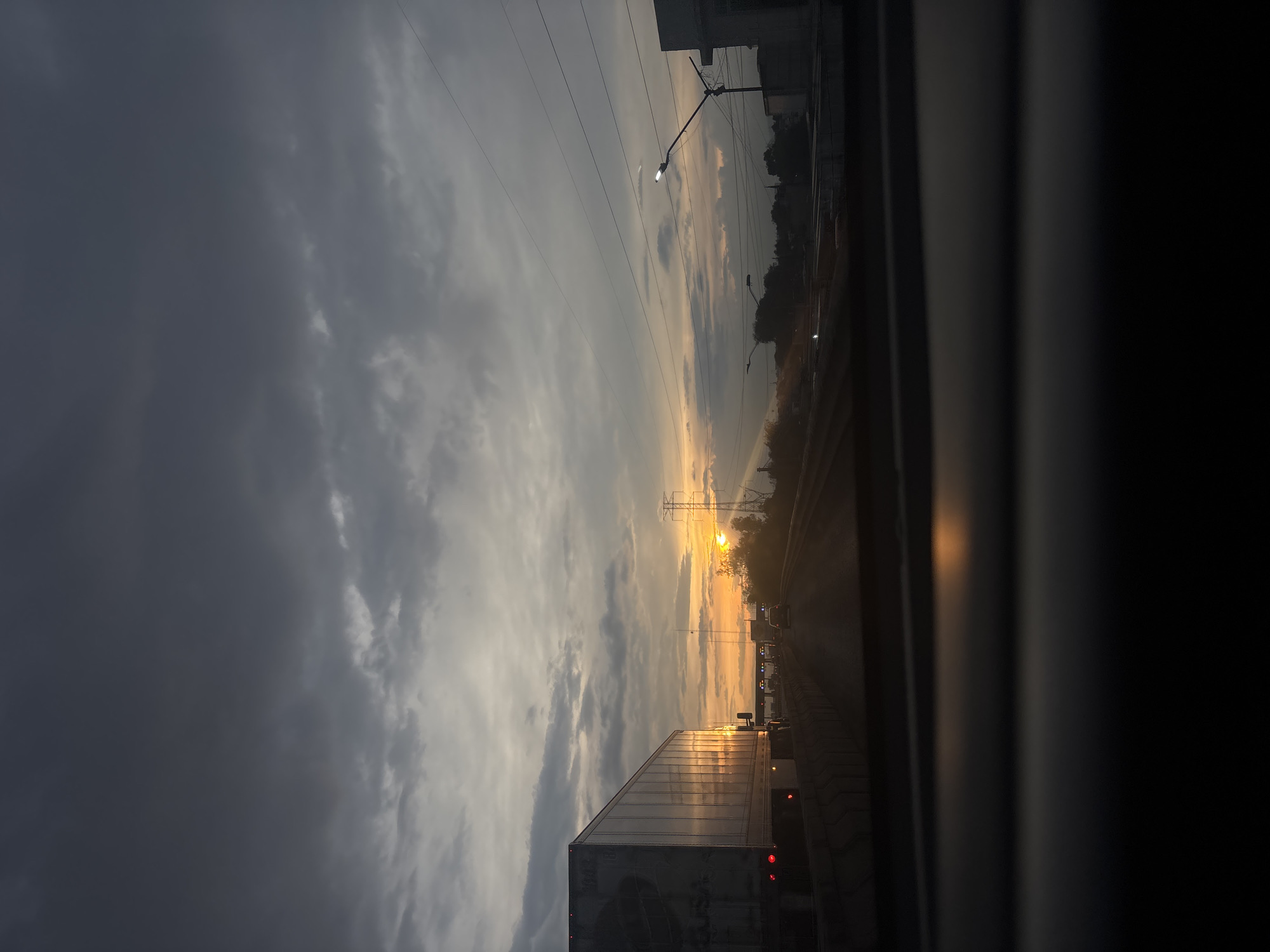 The image depicts a view from inside a vehicle, likely a car, traveling on a road in Tultitlán, Mexico. The sky is dominated by dark, heavy clouds to the left, transitioning to a lighter, hazy horizon towards the center where the sun is setting or rising. A large semi-trailer truck is visible on the road, partially obstructing the view. Power lines stretch across the upper portion of the frame, intersecting with streetlights along the roadside. The general environment suggests an industrial or highway setting, with elements of urban infrastructure. The image captures a moment of transition in lighting conditions, perhaps at dawn or dusk.