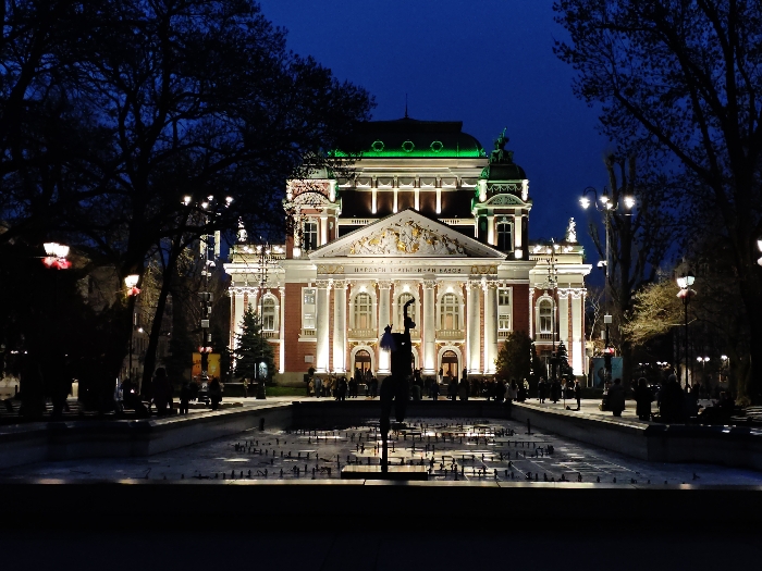 - "This image captures the illuminated Ivan Vazov National Theatre in Sofia, Bulgaria, at night" by FM-xCddJ3, licensed under CC BY 4.0