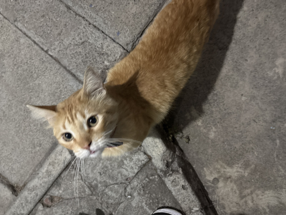An orange-furred cat, seen from above, occupies the central and right portions of the frame. Its head is tilted upwards and to the viewer's left, with large, dark eyes focused on an unseen point above. Long white whiskers extend from its muzzle. A thin, dark-colored collar is visible around its neck, from which a small, dark blue or black object hangs near its slightly open mouth. The cat's body extends towards the lower right. The ground is composed of textured, grey concrete or paving slabs, exhibiting irregular surfaces and faint lines. Distinct shadows are cast on the ground, indicating a light source from above and to the left. In the bottom-left corner, the edge of a human's foot is visible, wearing a black shoe with a prominent white sole. The scene occurs in Jiutepec, Mexico.