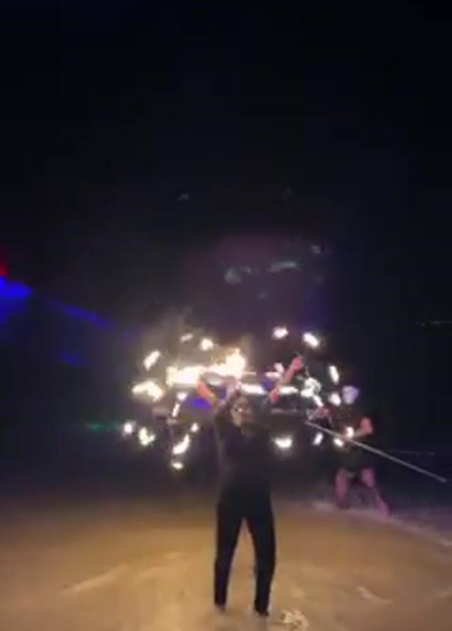 A woman in dark clothing performs fire dancing on a beach at night. She stands in shallow water, twirling flaming objects around her body, creating circles and patterns of light. In the background, another person wearing a mask holds a long, unlit prop, possibly for a later performance. Red and blue lights are visible, adding to the dramatic atmosphere.