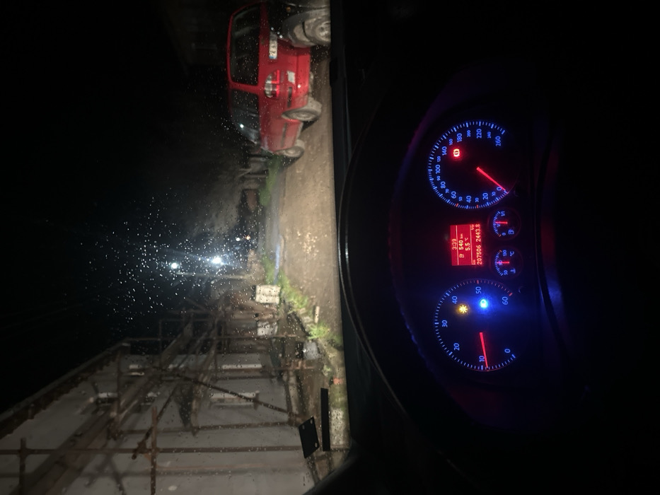 The image depicts a nocturnal scene in Kasnakovo, Bulgaria, viewed from the interior of a stationary vehicle looking through a rain-splattered windshield. The time is 3:39 AM, and the ambient temperature is 5.5 °C, as indicated by the illuminated instrument cluster in the foreground. The vehicle's odometer reads 207,506 km. Illuminated warning lights include a blue low-beam indicator and an amber bulb failure indicator. Outside the vehicle, a narrow, unpaved dirt road, visibly wet, stretches into the distance. To the immediate left, a multi-story building with prominent scaffolding suggests ongoing construction or renovation. To the right, a red minivan with a partially visible Bulgarian license plate is parked, facing away from the camera, and is partially obscured by the wheel of another dark vehicle in the extreme right foreground. Multiple streetlights illuminate the path ahead, creating bright focal points in the darkness. Trees or dense vegetation line the sides of the road further down.