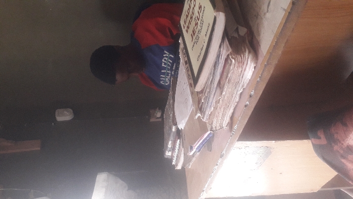 A person in a blue and red shirt, wearing a black hat, stands by a wooden table covered in various items. A stack of papers and books sits on the table, including a book titled "Leader Wisdom Jesus". Other small objects are scattered across the surface. A white, box-like object is on the floor in the background. The room appears dimly lit.