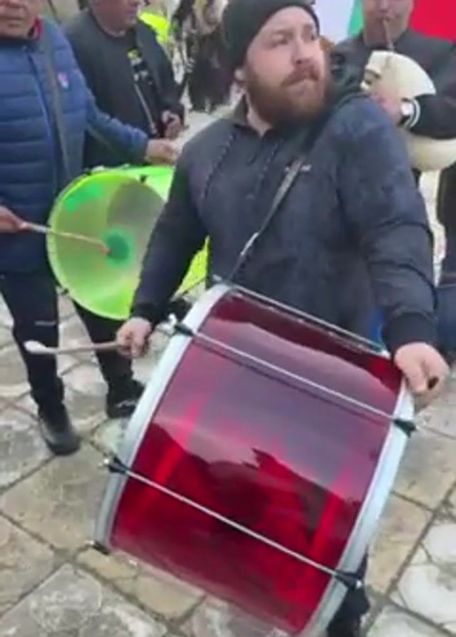 group of people performing music outdoors, seemingly during a festive event. There are four musicians visible in the foreground: one playing a red, cylindrical bass drum, another with a fluorescent green drum or tambourine-like instrument, a clarinetist, and someone playing what appears to be a bagpipe. The drummer in the foreground is a man with a beard, wearing a black beanie and a grey patterned sweatshirt. He's striking the red drum with a stick in each hand. The person with the bagpipe is holding a Bulgarian flag. Several other people are visible in the background, some in traditional clothing, and some onlookers. The ground is paved. It appears to be a daytime outdoor event in a village or small town, possibly a cultural celebration.