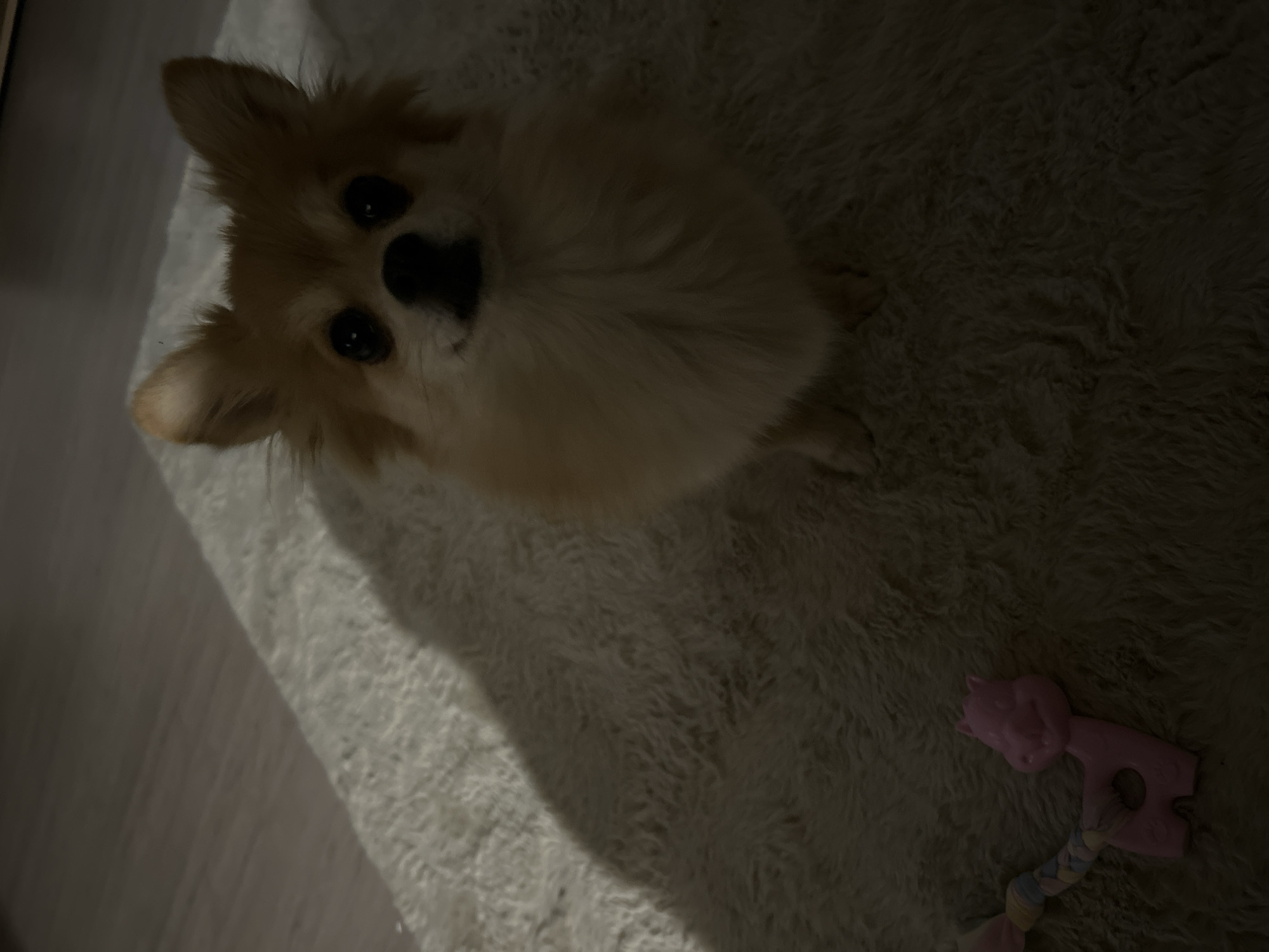 A small, light-brown, long-haired dog is looking up at the camera. The dog is standing on a light-colored, fluffy rug. A pink dog toy lies near the edge of the rug. A wall or floor is visible in the background, to the left of the dog. The photograph appears to be taken indoors in a low-light setting. There is no verifiable evidence to confirm the location is Varshets, Bulgaria.