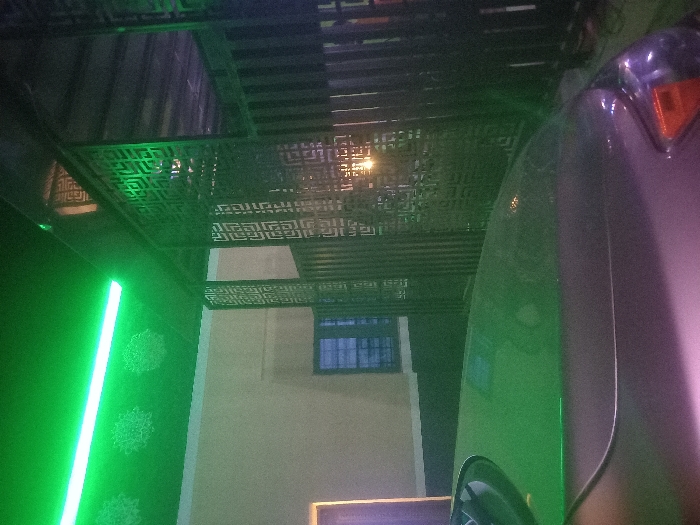 A blurry image features a partially visible car, illuminated in pink and green. The car appears to be parked under a decorative metal structure with an intricate geometric pattern. A green neon light runs vertically along a wall, which also features decorative floral patterns. A window is visible in the background, situated on a cream-colored building. The lighting casts an eerie glow on the scene.