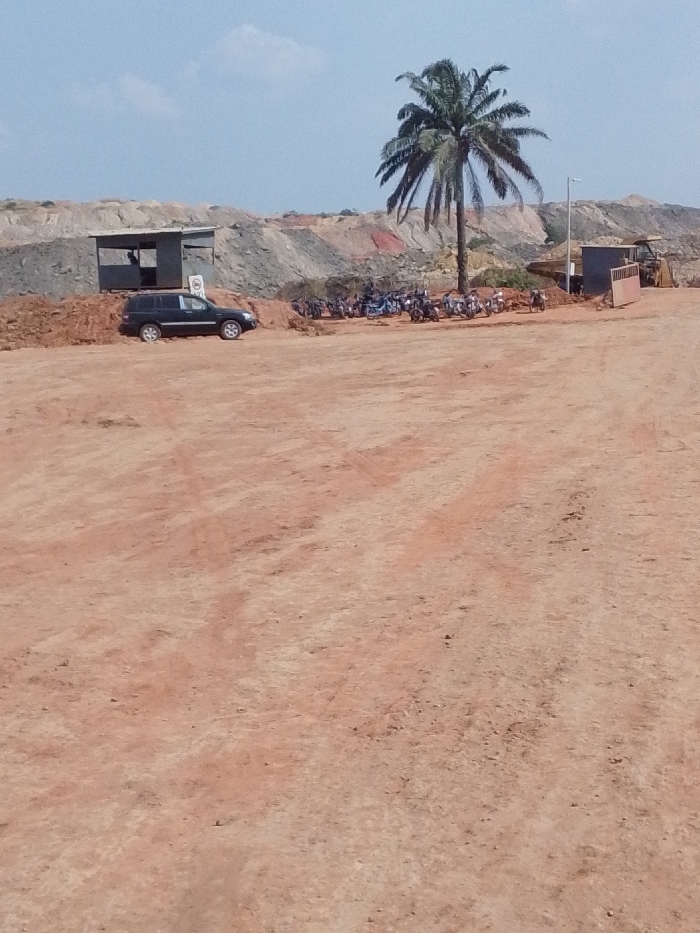A dirt area leads to a palm tree, with some motorcycles parked nearby. A black SUV is parked by a small guardhouse. Behind, there are piles of grey, reddish and brownish hills. A security light pole stands next to a metal gate. The sky is blue with scattered clouds.