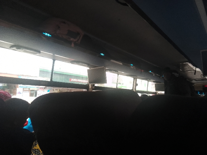 The image depicts the interior of a passenger vehicle, likely a bus, from a forward-looking perspective, with the exterior street visible through the windows