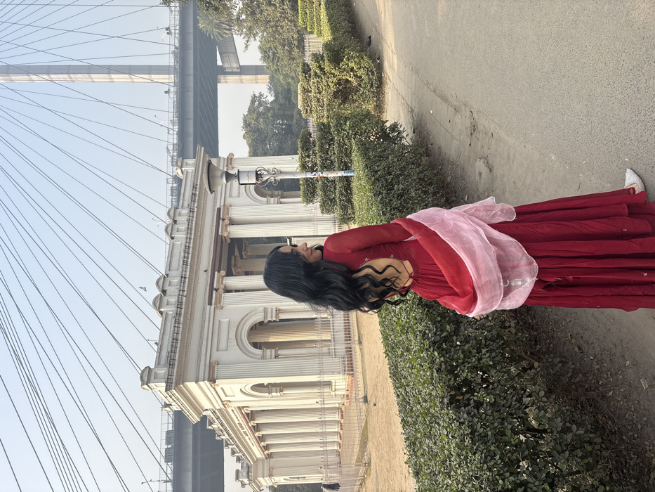 A woman in a red dress with a light pink scarf stands sideways near lush green bushes. Her long, dark hair cascades down her back. In the background, a stately white building with arched doorways and a columned façade is visible, partially obscured by the foliage. Beyond the building, a large suspension bridge looms against a pale sky. The setting appears to be a park or garden adjacent to a historical structure.