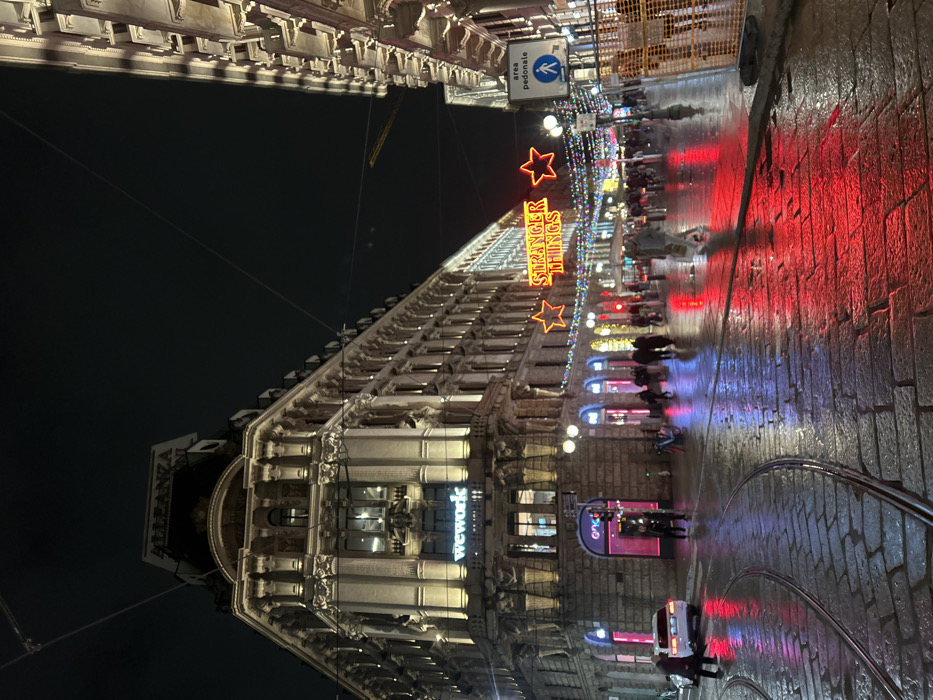 At night, a tall, ornate building is illuminated, with a "we work" sign visible. A neon "STRANGER THINGS" sign hangs above the street, decorated with stars. Pedestrians walk on a wet cobblestone street, their reflections appearing distorted in the puddles. Red and blue lights are reflected on the wet pavement. Street lights and other buildings line the street, creating a vibrant urban scene.