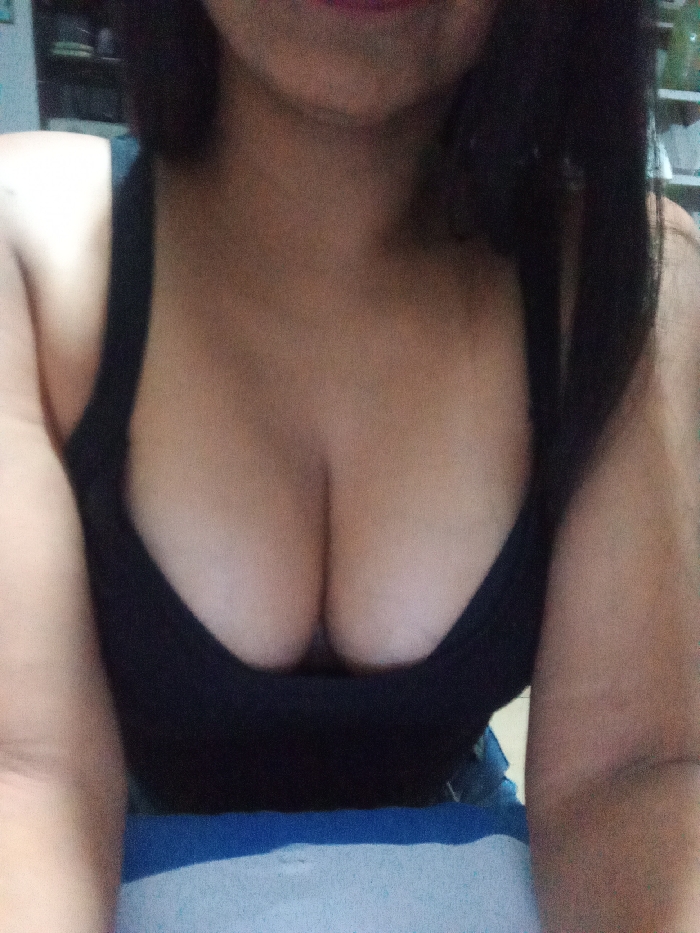 A close-up, chest-level image depicts an adult female with light-to-medium skin tone and dark, straight hair. She is wearing a black, deep-V neck tank top or camisole, prominently displaying her cleavage. A portion of her face is visible from the mouth upwards, with pink lipstick or lip gloss present. Below the black top, a horizontal band of blue fabric is discernible, followed by a lighter grey or white fabric, possibly part of a lower garment or an object. The background is heavily blurred and out of focus, indicating an indoor setting with indistinct shapes suggesting furniture or shelving. No specific actions or interactions are visible beyond the subject facing the camera. The image provides no discernible visual information to identify a specific location within Caracas, Venezuela.