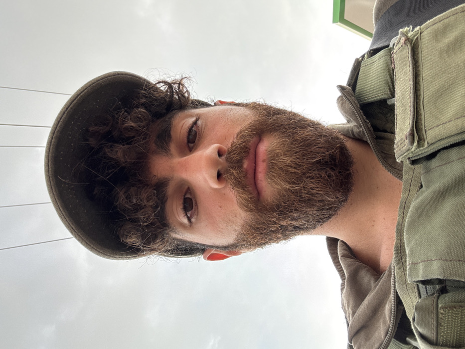 A male individual is depicted in a close-up, low-angle selfie, looking directly into the camera. He has dark, curly hair protruding from under a dark olive-drab cap and a full, reddish-brown beard and mustache. His skin tone is fair to olive. He wears an olive-drab tactical vest with visible pouches and straps, a light brown or grey hooded garment beneath it, and a dark strap of a bag over his left shoulder (viewer's right). The background consists of a predominantly overcast, light grey sky with several thin, dark horizontal lines, likely overhead power or communication cables. A small portion of a structure with green and white elements is visible on the far right. Specific details for geopolitical localization within Brener Regional Council, Israel, are not discernible from the image.