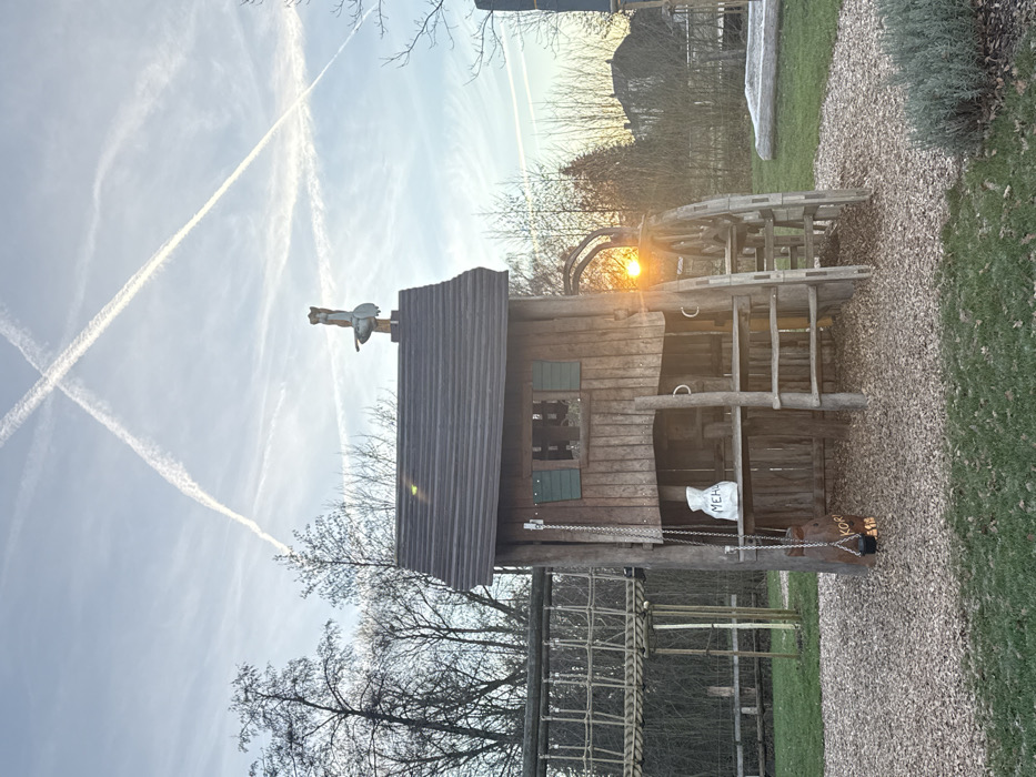 The image depicts an outdoor playground scene in Olingen, Luxembourg, under sunset conditions. Multiple contrails are visible in the light blue sky, with two forming a distinct 'X' pattern in the upper center. Central to the frame is a multi-level wooden playhouse structure featuring a dark shingled roof. Affixed to the roof is a carved wooden figure of an anthropomorphic animal holding a drum. The playhouse includes a window with green shutters. An exterior shelf on the left side holds a white bag labeled "MEHL." Below this shelf, a black bucket hangs from a metal chain, positioned above a partially visible carved wooden log marked "KORN." A wooden ladder ascends the right side of the playhouse. The ground immediately surrounding the structure is covered with wood chips. To the left, a rope and wooden bridge playground element is partially visible amidst bare trees. On the right, the setting sun casts a strong orange glow through a wooden archway, with additional bare trees and distant residential buildings in the background. No persons are visible in the scene.