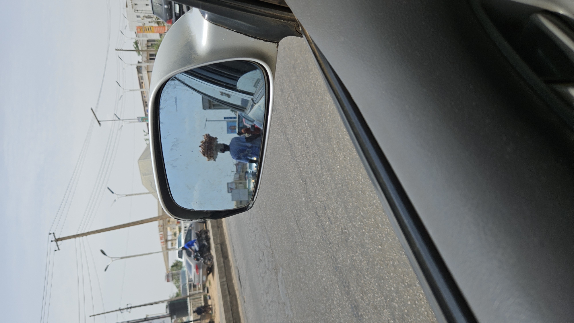 side view mirror of a car reflecting a street scene in Maiburiji, Nigeria