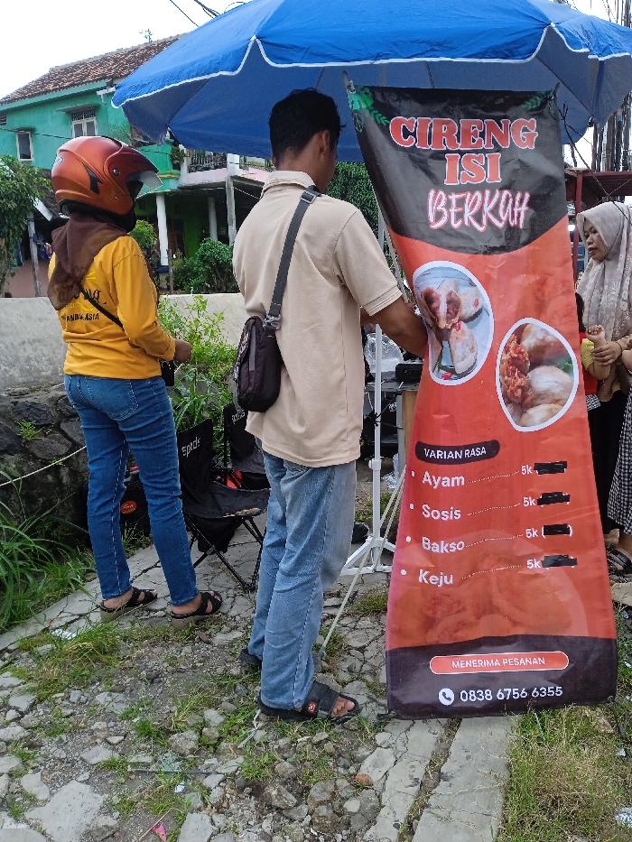 An outdoor scene in Kauman, Indonesia, depicts a street food stall operating under a blue market umbrella. In the center, a person wearing a light brown short-sleeve shirt, blue jeans, and black sandals, with a dark shoulder bag, stands facing away from the camera, positioned behind a vertical red and black banner. The banner advertises "CIRENG ISI BERKAH" (Filled Cireng Berkah), displaying images of cireng with various fillings, a menu listing "Ayam," "Sosis," "Bakso," and "Keju" for 5,000 IDR each, and a contact number for orders. To the left, a person wearing a yellow long-sleeve shirt, blue jeans, and an orange motorcycle helmet stands with their back mostly to the camera, beside a black folding chair. Partially visible on the far right, another person wearing a light-colored hijab appears to be interacting with the stall. The ground is a rough, broken paved surface with patches of grass and weeds. In the background, residential houses with varied colors, including a green one with a brown tiled roof, are visible. A low stone wall is present on the left side of the scene.