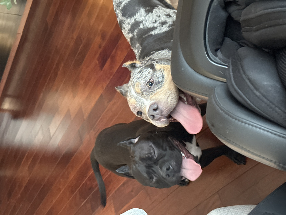 Two domestic dogs are depicted within an indoor environment with a polished reddish-brown hardwood floor. The dog on the left is predominantly black with white markings on its chest, has its eyes closed, and its pink tongue is fully extended. The dog on the right features a black and grey merle coat with tan facial markings, has its eyes open and directed towards the viewer, and its pink tongue is also fully extended. Both animals exhibit characteristics consistent with bully breeds and appear to be panting. A dark-colored collar is visible on the black dog. A black padded chair is partially visible in the lower right foreground, and a light-colored, upholstered furniture item is partially visible in the lower left foreground. The location in the city of Saint Petersburg, Russia, cannot be determined from the visual information present in the image.