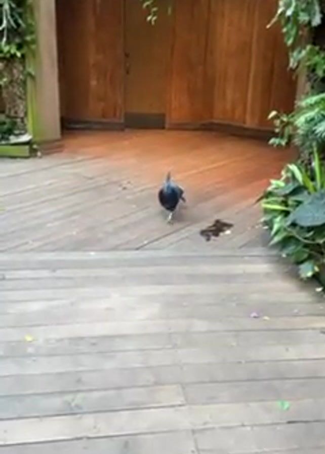 blue Victoria crowned pigeon walking on a wooden deck