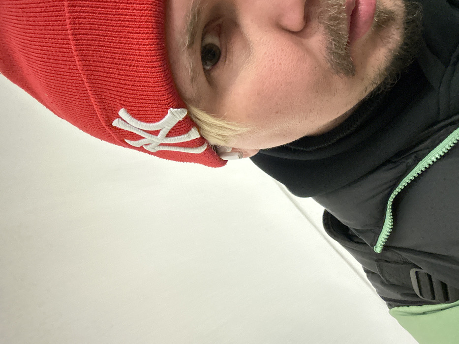An off-kilter selfie displays a person wearing a red knit cap adorned with a white "KY" logo. Blond hair peeks out from under the cap. The person has facial hair and fair skin. They wear a black hoodie under a dark vest with a light green zipper. The background appears to be a white, blank wall.
