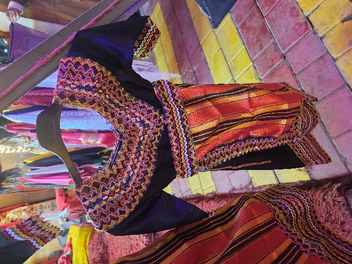 A black garment with elaborate, colorful embroidery adorns the neck and sleeves. A horizontally striped fabric, primarily in orange and red hues with dark lines, is attached to the lower portion. The garment hangs from a wooden hanger amidst a backdrop of colorful textiles. A patterned floor, brick-like, is visible in the background.