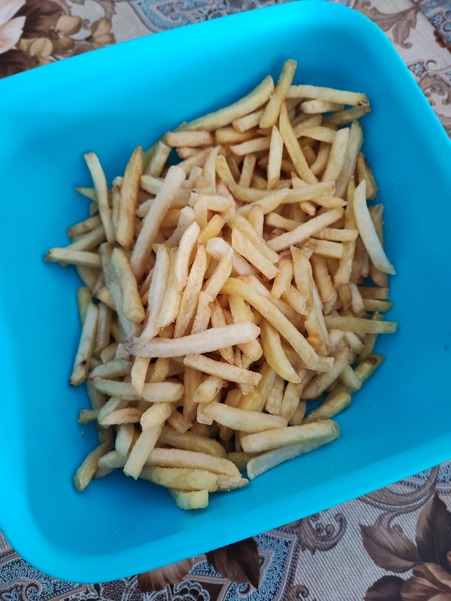 - "A blue plastic container is filled with a pile of pale, slightly golden French fries" by FM-7CnuG3, licensed under CC BY 4.0