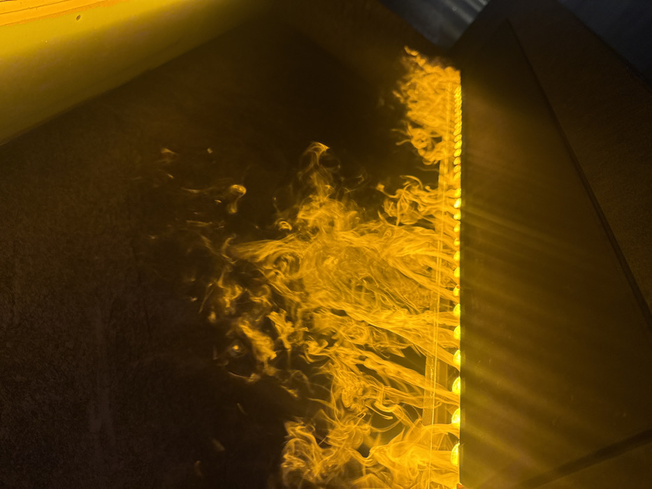 The image displays a simulated fire installation located in Bania, Bulgaria. A horizontal linear array of individual, spherical yellow-orange light sources runs across the lower mid-section of the frame, illuminating upward-flickering, orange-yellow patterns that mimic natural flames. These luminous patterns rise against a dark, unidentifiable background surface, suggesting light interacting with a medium such as vapor or air currents. The foreground consists of a dark, reflective horizontal surface, exhibiting distinct light streaks reflecting the primary light sources. A bright yellow-orange illuminated surface or structural element is partially visible in the upper right portion of the scene. No individuals are present.
