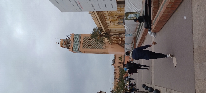 An outdoor scene features a tall, ornate minaret rising prominently. A palm tree stands near the minaret, adding to the exotic atmosphere. People stroll along a paved walkway adjacent to a low wall or building edge. A partial banner or sign hangs near the top of the frame. The sky is overcast, casting a soft, diffused light on the scene.