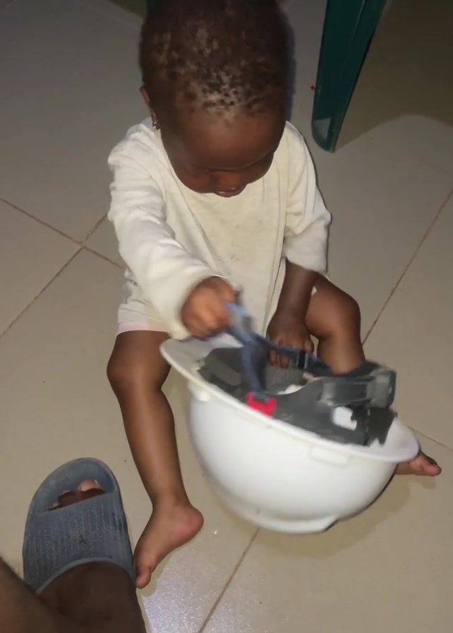 A young, dark-skinned toddler in a long-sleeved, white romper sits on a tiled floor. The toddler has short, dark, curly hair and is playing with a white construction helmet. They hold the helmet upside down and appear to be taking something out of it. A person wearing gray slippers is visible on the left side of the frame. A green plastic chair stands in the background. The toddler then shifts to a hands-and-knees position, continuing to interact with the helmet.