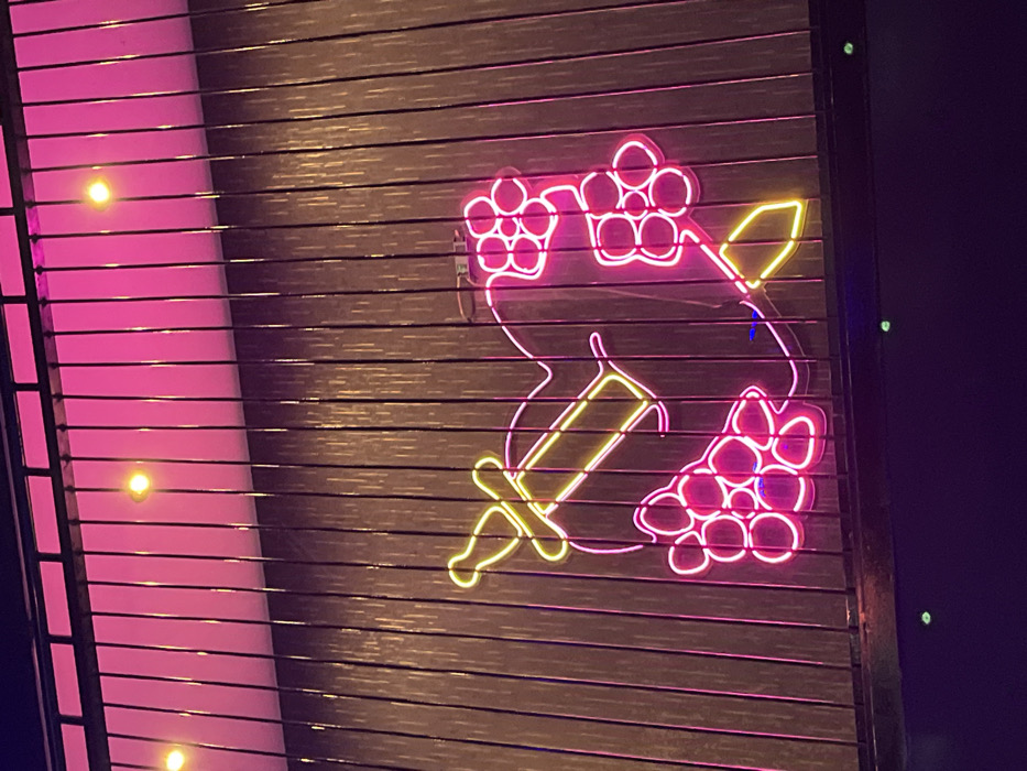 A neon sign adorns a slatted wooden surface. The sign depicts two bunches of grapes, illuminated in bright pink neon, flanking a golden yellow neon sword. The slats create horizontal lines across the image. A pink, illuminated surface is visible to the left, punctuated by small, round lights. The right side of the frame is dominated by a dark, unlit area.