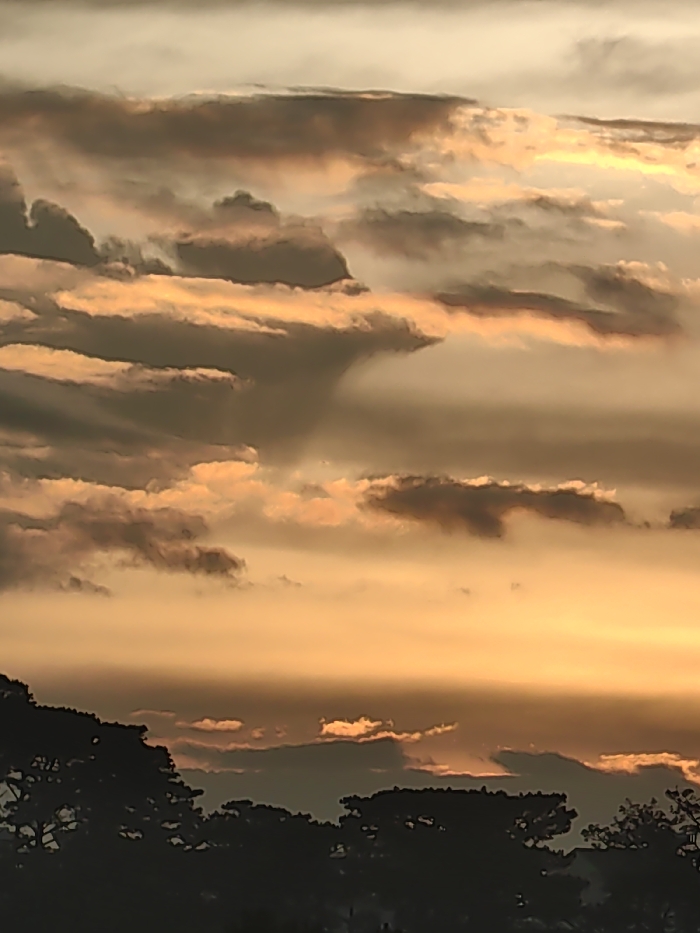 The image displays a panoramic view of a sky at either sunrise or sunset over Da Lat, Vietnam. The upper two-thirds of the frame are dominated by a complex arrangement of clouds, illuminated with intense warm tones of orange and yellow, interspersed with darker grey and purple hues. Sunlight appears to originate from a low angle on the horizon, casting illumination on the undersides and edges of the multi-layered cloud formations. Some clouds exhibit clear linear streaks of light, while others are more amorphous. The lower third of the image reveals a dark, silhouetted tree line, primarily composed of coniferous trees, which obscures the immediate foreground and any specific architectural details of the city. No individuals, vehicles, or distinct man-made structures are visible within the frame.