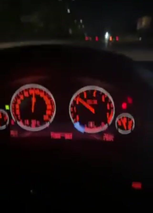 A first-person perspective video shows the interior of a car driving at night. The illuminated dashboard is prominent, displaying gauges like speed and RPM. Other cars are visible ahead on the road. Music plays throughout the video.
