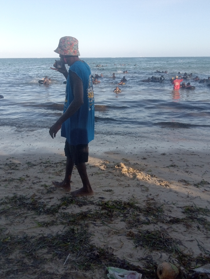 The image displays a coastal scene in Shanzu ward, Kenya, featuring a sandy beach and ocean under a clear, light blue sky. In the foreground, a dark-skinned individual, presumed male, walks barefoot along the water's edge, facing left. The individual wears black shorts, a light blue sleeveless top with yellow and white graphics on the back, and a multi-colored bucket hat. This person is holding a small, dark object to their mouth or chin with their right hand. The sandy beach is scattered with dark green and brown seaweed. A white plastic wrapper and a coconut husk are visible on the sand in the lower right foreground. In the mid-ground and background, approximately 20 to 30 people are present in the ocean. Many are partially submerged, engaged in swimming or bathing activities, with several utilizing black inner tubes as flotation devices. One individual in the mid-ground wears a bright red garment. Small waves are visible across the water. Sunlight casts shadows from a low angle, indicating daytime.