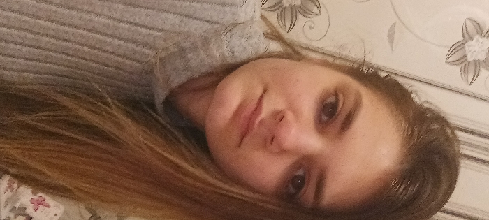 A close-up, head-and-shoulders portrait shows a young adult female looking directly into the camera with a neutral expression