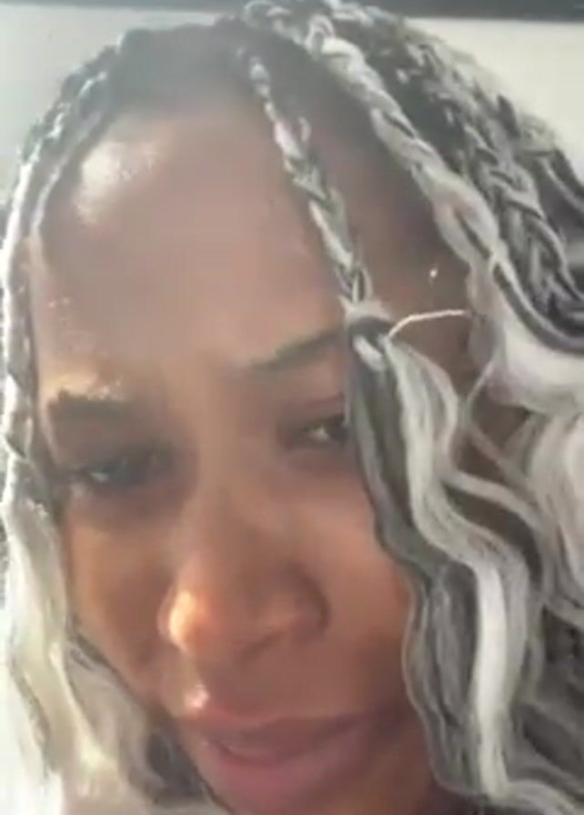 A medium close-up shot shows a woman’s face. She is centered in the frame and looks down. She is light-skinned with brown eyes. She has black and silver braids that frame her face. She wears a gray jacket and gold necklace. The background is blurred.